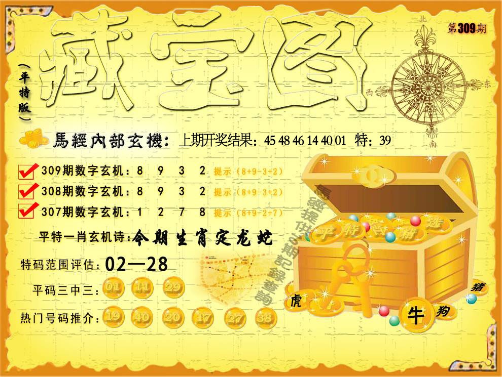 309期【今期生肖定龙蛇】 解:今期生肖定龙蛇,平特虎牛 特码范围评估:02-28 |
